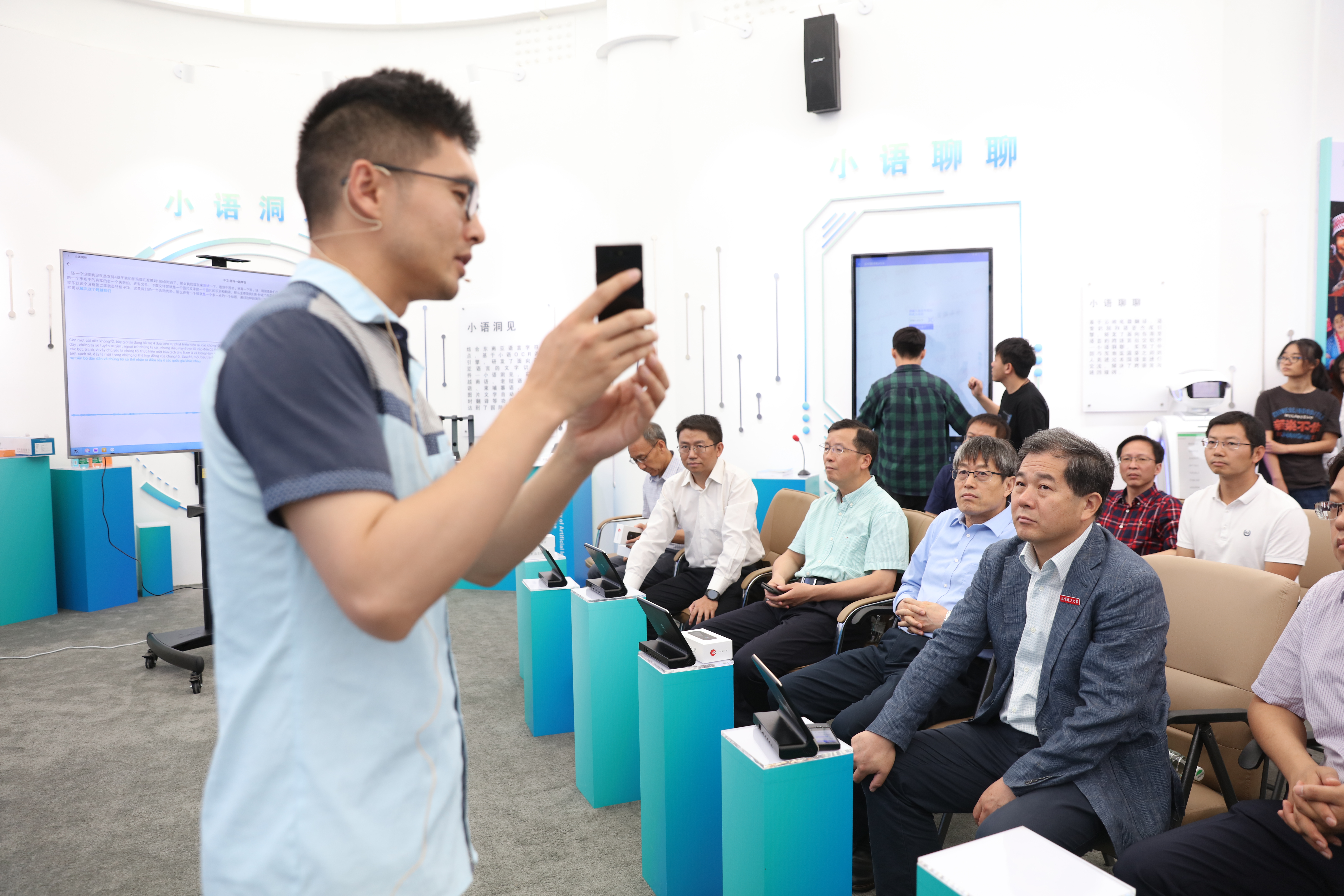 王文君博士通过实验室研发的终端设备给大家演示了多语言讲解器、多语言会话系统、多语言会议系统可应用于国际会议、国际学术交流、国际贸易洽谈等场景。